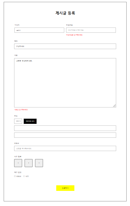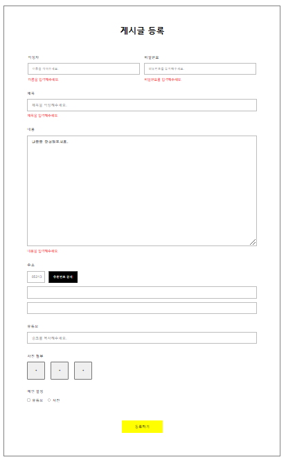 필수 입력 요소(이름, 비밀번호, 제목, 내용)을 입력하지 않고 게시글 등록 버튼을 터치하면 하단에 오류 메시지가 출력되도록 작성하였다.